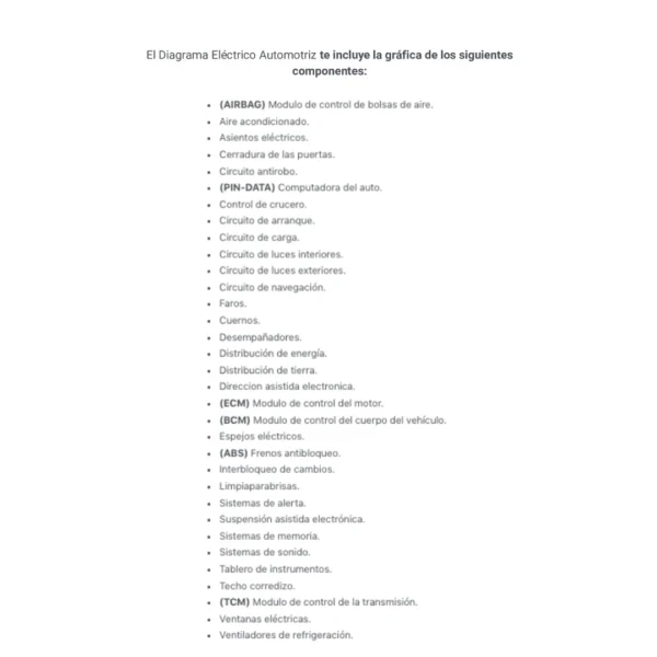 El Diagrama Eléctrico Automotriz te incluye la gráfica de los siguientes componentes: